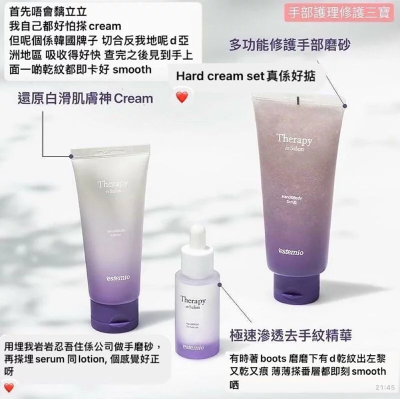 #第一寶 極速滲透 去手紋精華液 達致最佳水油平衡 極速滲透肌膚細胞 天然荷荷巴油減淡皺紋 防止肌膚老化 由內到外都咁水潤 #第二寶 多功能修護磨砂 去角質同時護膚 絕對唔傷手 磨砂同時補充水份 修護雙手 溫和草本花香味 #第三寶 神Cream 鎖水力極強 快速改善乾燥問題 夏威夷果仁籽油滲透肌膚底層 保持水潤 內含豐富按摩精華粒子舒緩肌膚 限時套裝價 價錢已做二送一優惠, 美女們可自助下單